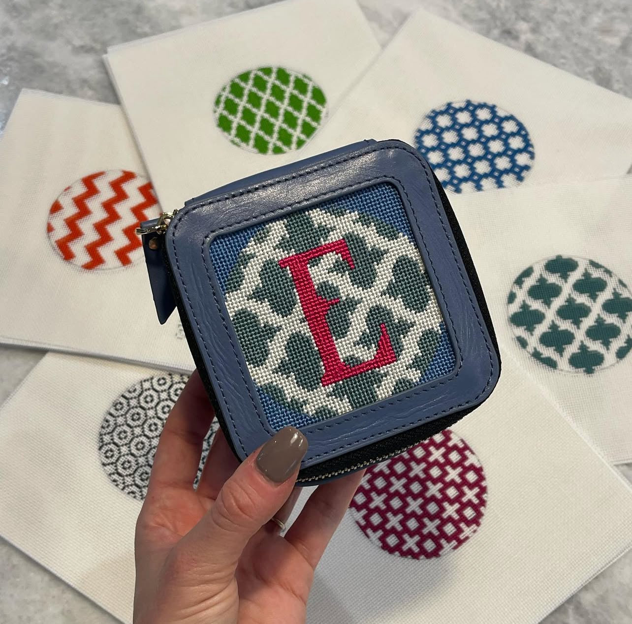 Experience luxury and sophistication with these round inserts on needlepoint canvas, perfect for elevating your decor. Artfully crafted and exquisitely detailed, these inserts are the ideal choice for the discerning collector.