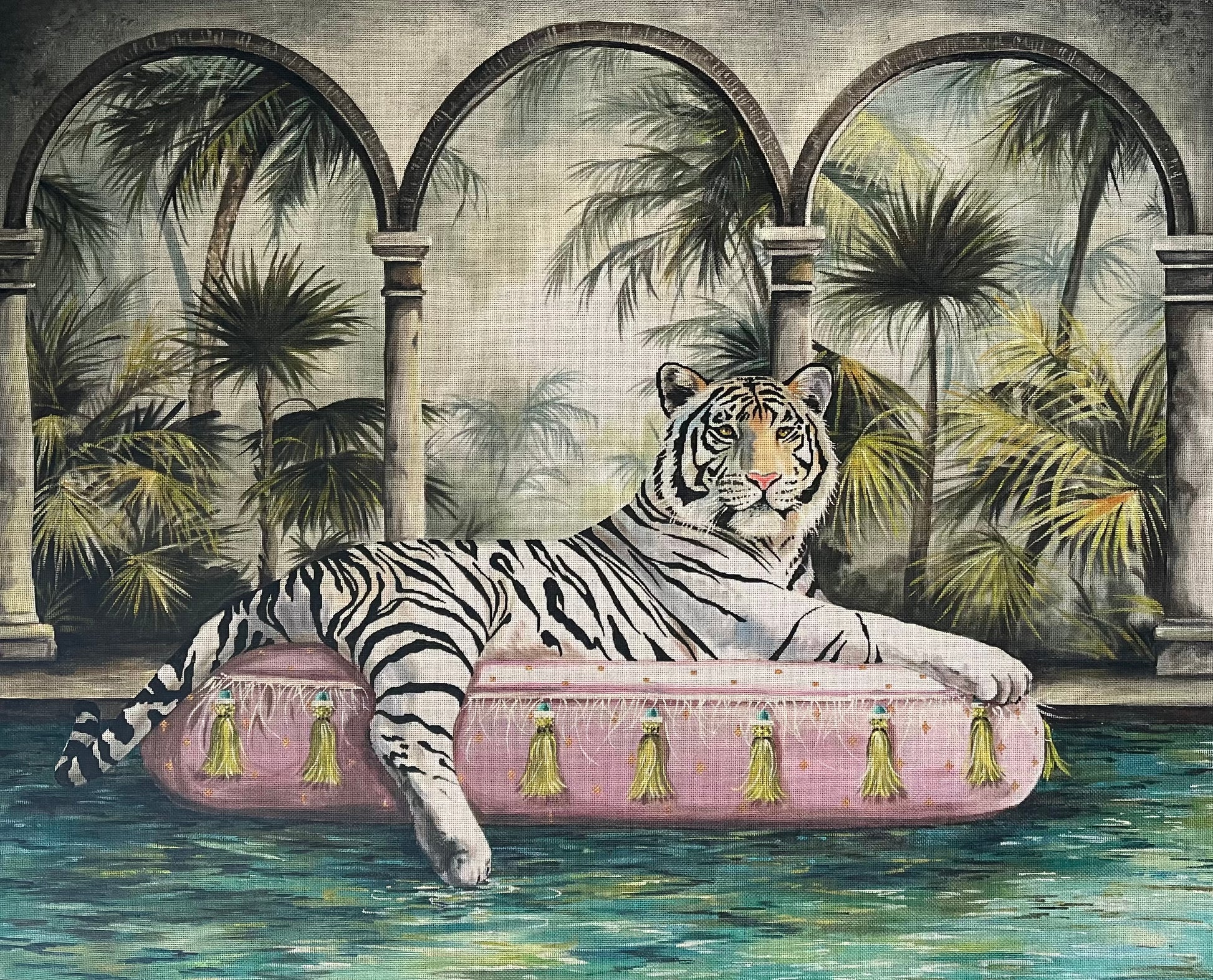 This beautiful one of a kind tapestry was hand-painted and designed by Marie Barber and made its debut at the Aristeia Needlepoint retreat at the Ritz-Carlton Laguna Niguel in Dana Point, CA.